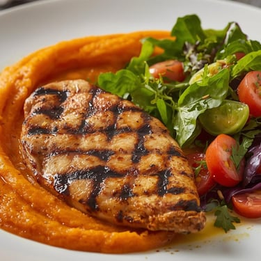 🥗Frango Grelhado com Purê de Batata Doce e Salada Colorida
